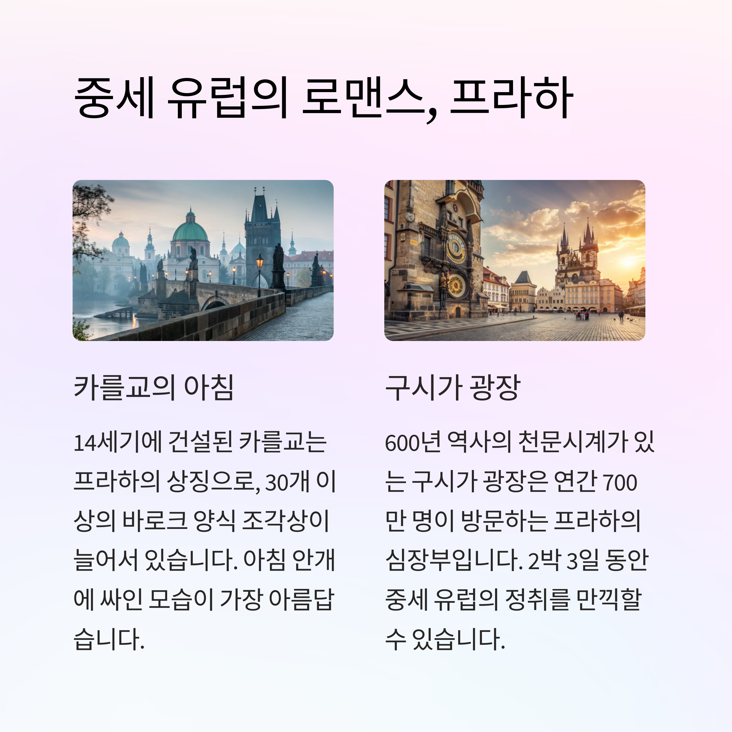 - 구시가광장에서는 천문시계와 다양한 거리 공연으로 매 순간 즐거움을 얻을 수 있어요.