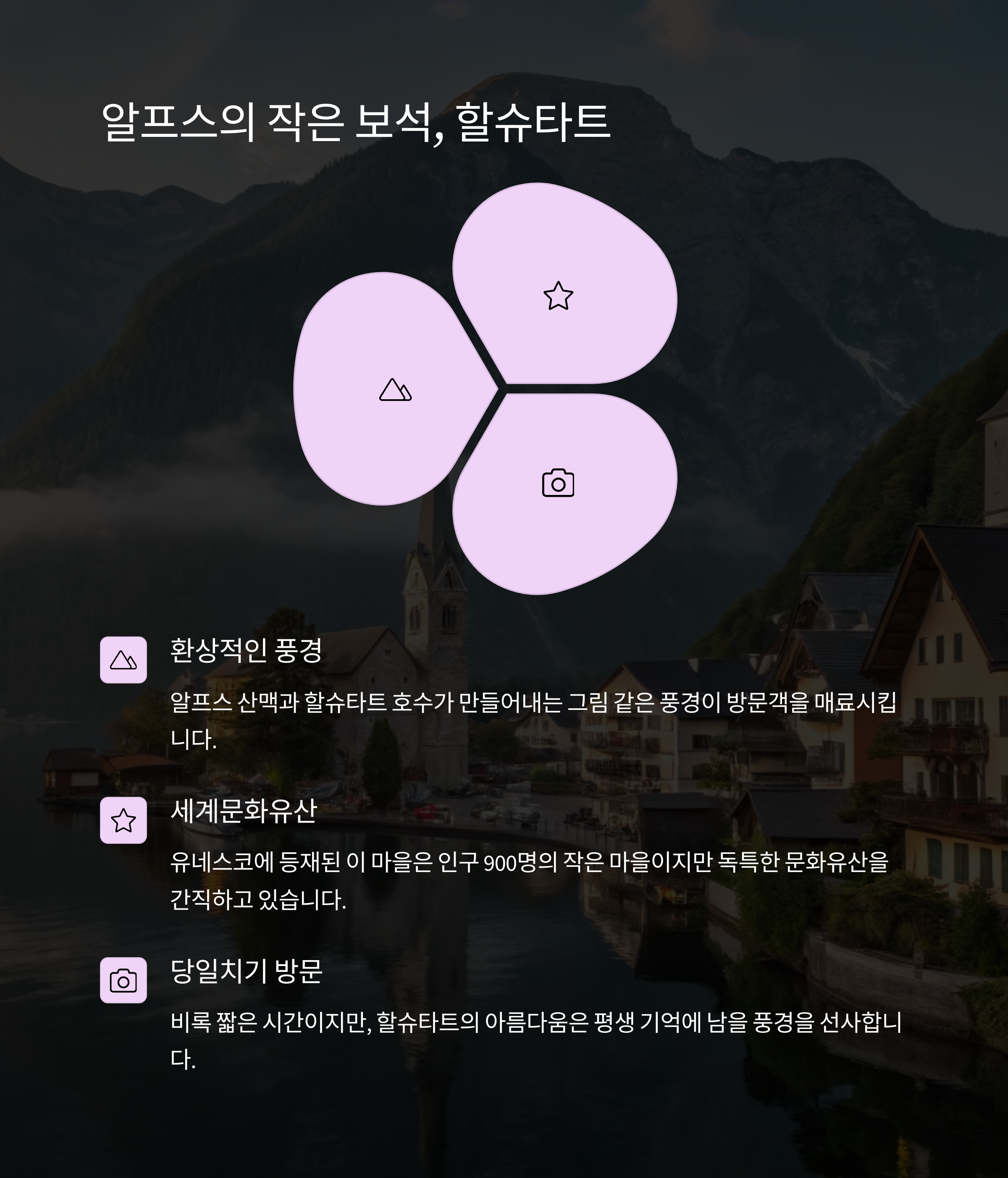 오스트리아의 작은 마을 할슈타트는 호숫가에 위치해 산과 물이 어우러진 그림 같은 풍경을 자랑합니다.