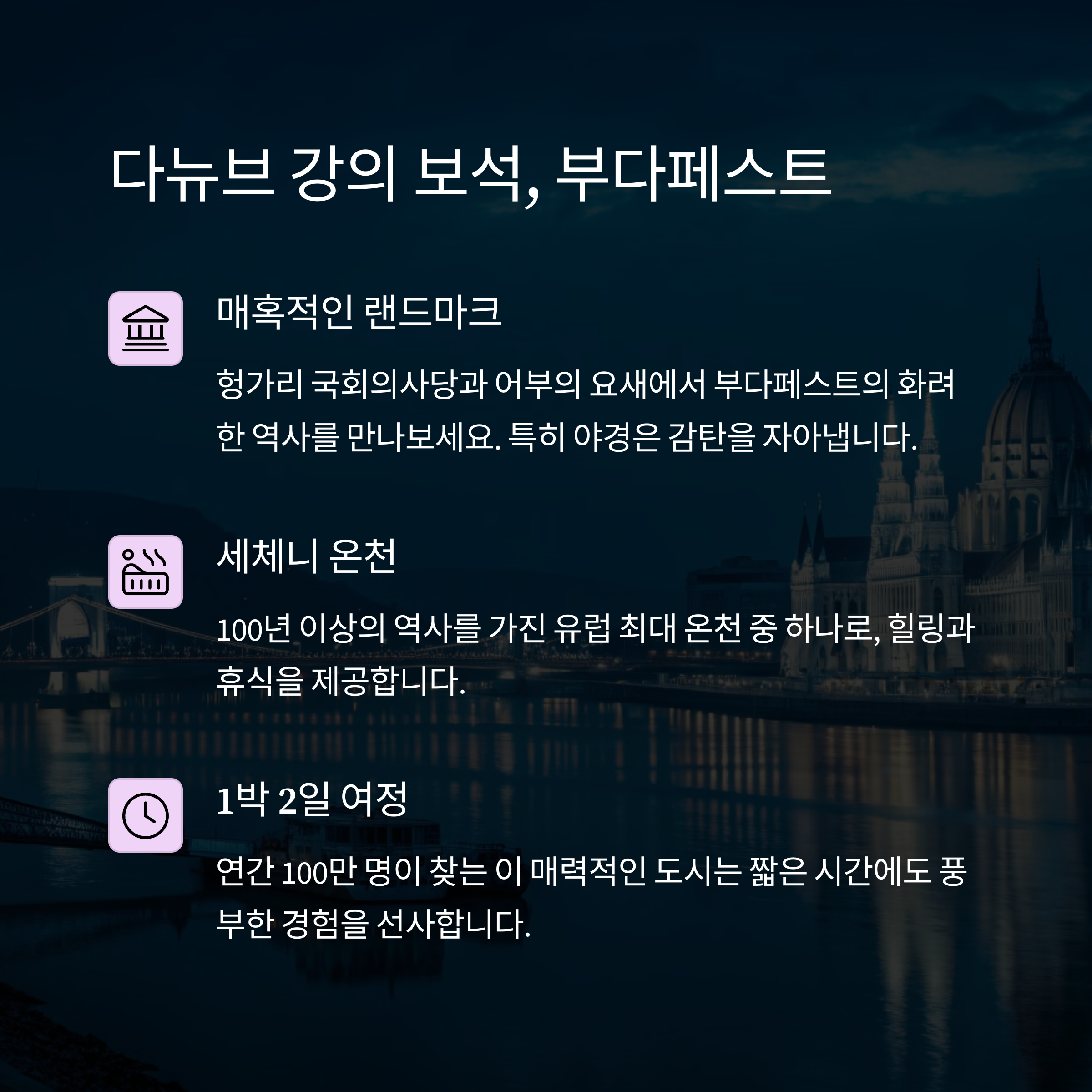 동유럽은 각 도시마다 독특한 매력을 지니고 있어 경이로움으로 가득합니다. 부다페스트의 우아한 야경, 프라하의 중세 유산, 그리고 할슈타트의 평온한 전경까지… 이 여정은 여러분께 오래도록 기억에 남을 소중한 추억이 될 것입니다. 지금 바로 여행 계획을 세워보세요!
