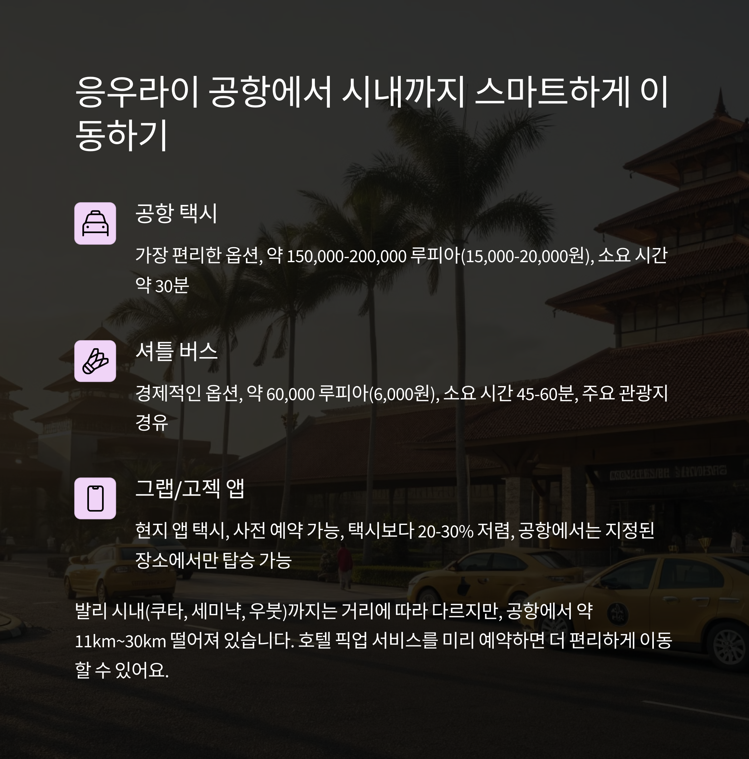 발리 응우라이 국제공항(DPS)은 주요 관광지와 가까운 거리에 위치하며