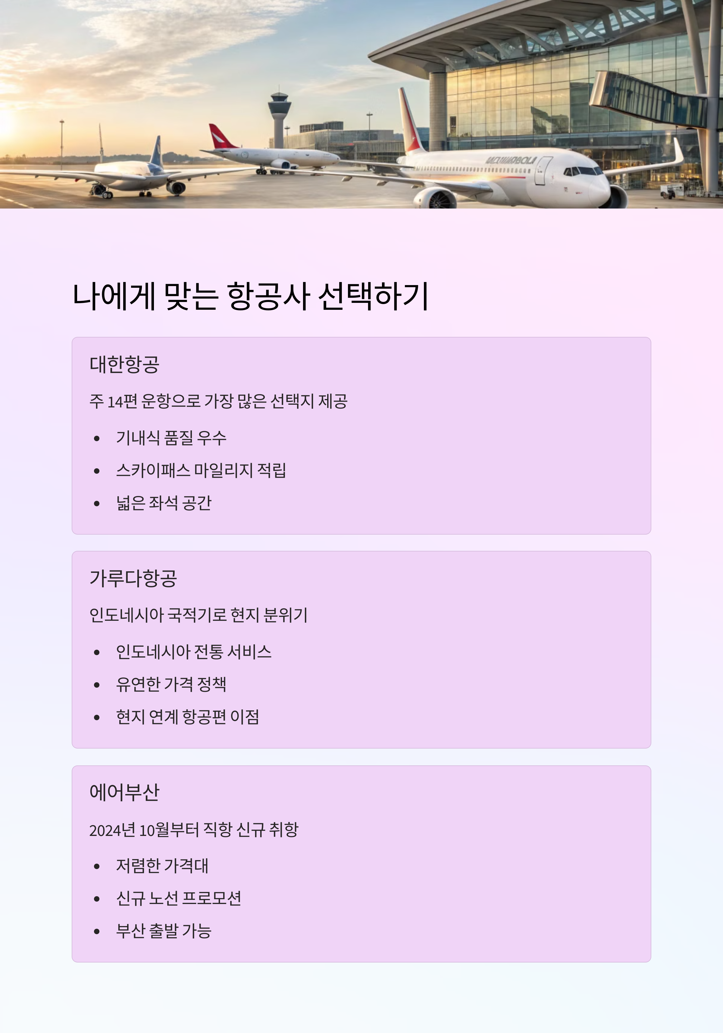 서울에서 발리를 오가는 직항편은 대한항공과 가루다항공이 대표적입니다.