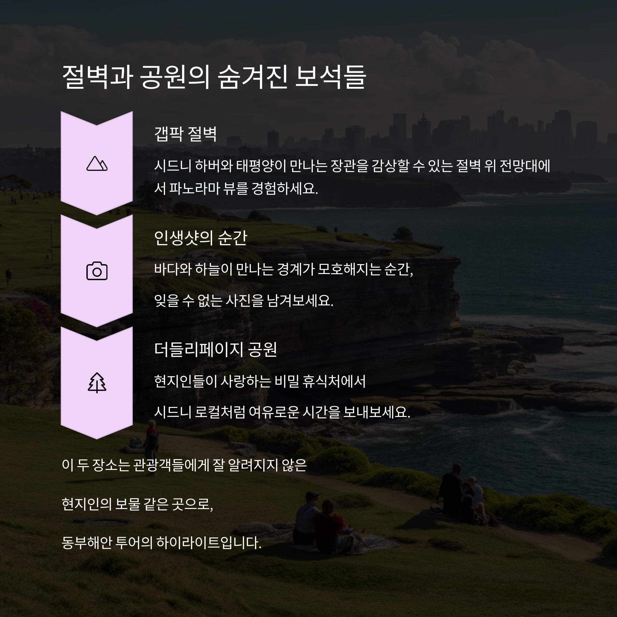 시드니 동부해안 투어는 아름다운 해안을 따라 자연과 도시의 조화를 느낄 수 있는 완벽한 코스입니다.