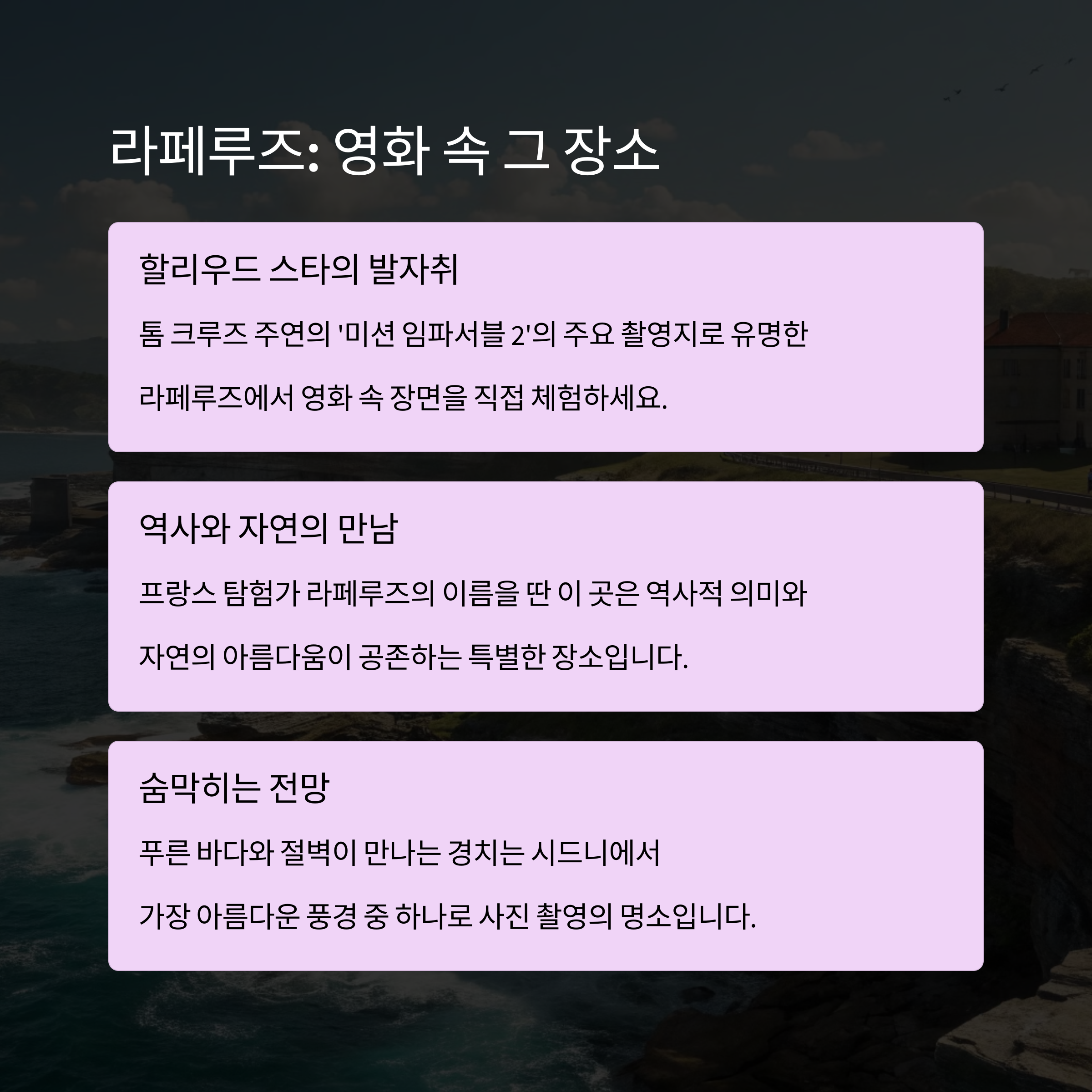 1. 라페루즈: 해안선을 따라 독특한 풍경을 감상하며 카메라에 담기 좋은 명소입니다.