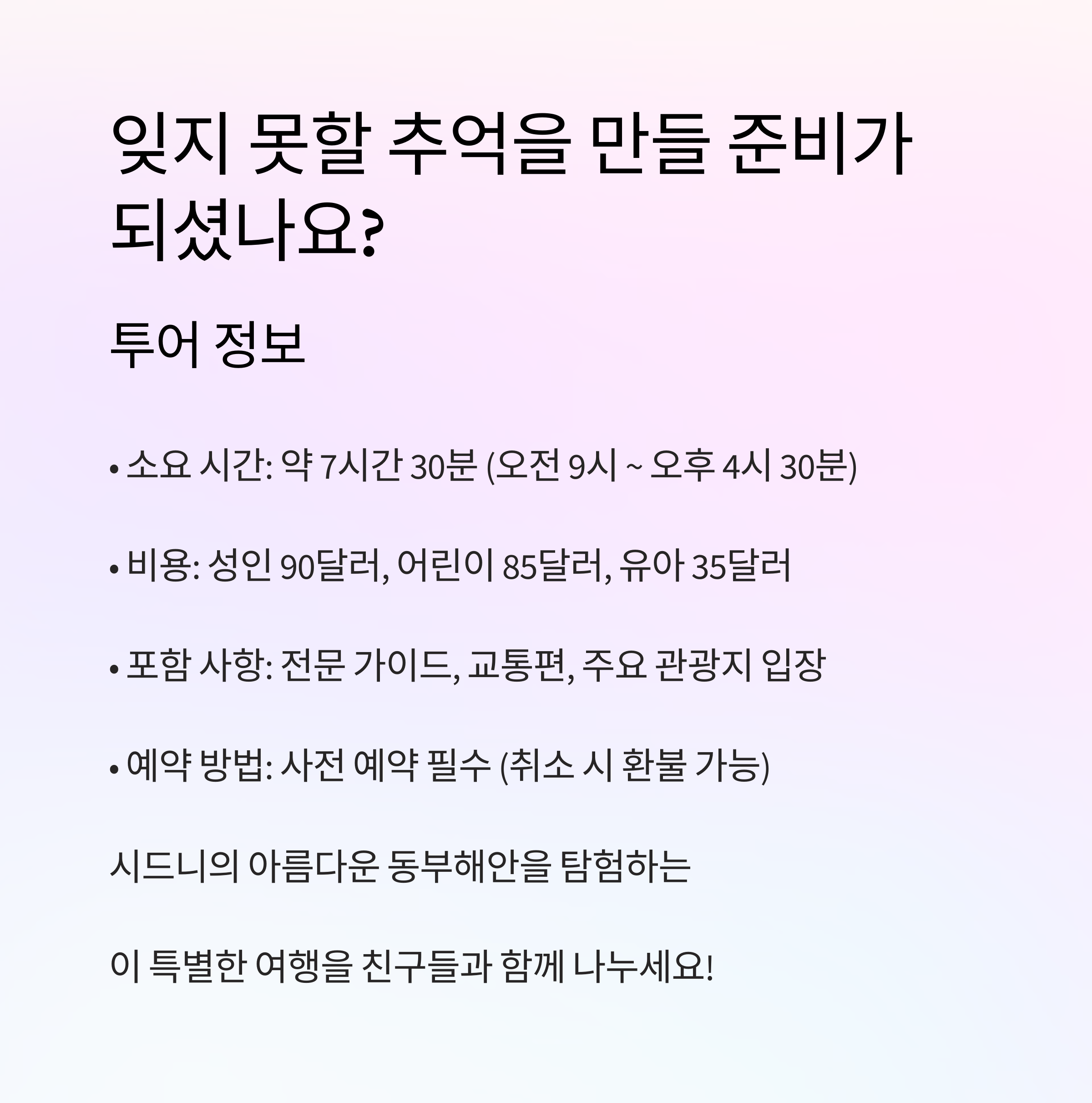해외 여행을 준비 중이시라면 시드니 동부해안 투어는 꼭 추천드리고 싶은 코스입니다.